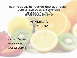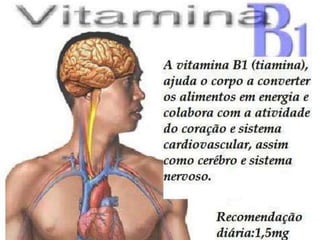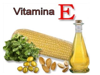 O documento resume informações sobre as vitaminas E, B1 e B2. A vitamina E é um antioxidante que protege as células contra danos e pode evitar abortos. A vitamina B1, também chamada de tiamina, é essencial no metabolismo de energia e tem papel importante na condução de nervos. A vitamina B2, ou riboflavina, é constituinte de enzimas importantes para o transporte de oxigênio e processos de oxidação celular.