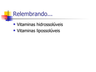 O documento resume as propriedades químicas e bioquímicas das vitaminas hidrossolúveis e lipossolúveis. Detalha as funções, fontes e estabilidade de cada vitamina, incluindo tiamina, riboflavina, niacina, ácido pantotênico, B6, ácido fólico, B12, C, A, D, E e K.