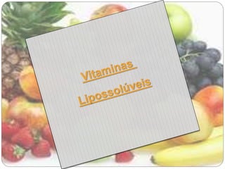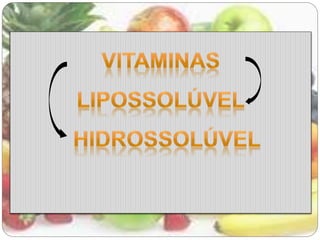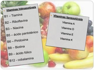 O documento discute as vitaminas, seus tipos, funções, carências e excessos. As vitaminas são divididas em lipossolúveis (A, D, E, K), absorvidas com gorduras, e hidrossolúveis (C, complexo B), solúveis em água. Uma dieta balanceada é necessária para obter as vitaminas, cuja falta causa avitaminose e excesso causa hipervitaminose.