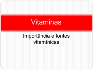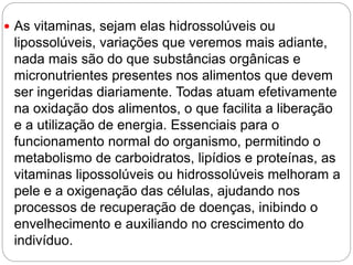 O documento discute as vitaminas, suas fontes, importância para o organismo e classificação. É explicado que as vitaminas são substâncias orgânicas essenciais para o metabolismo e que existem 13 tipos principais que devem ser ingeridas por meio dos alimentos. As vitaminas podem ser classificadas em hidrossolúveis ou lipossolúveis e são importantes para diversas funções fisiológicas. A deficiência ou excesso de vitaminas pode prejudicar a saúde.