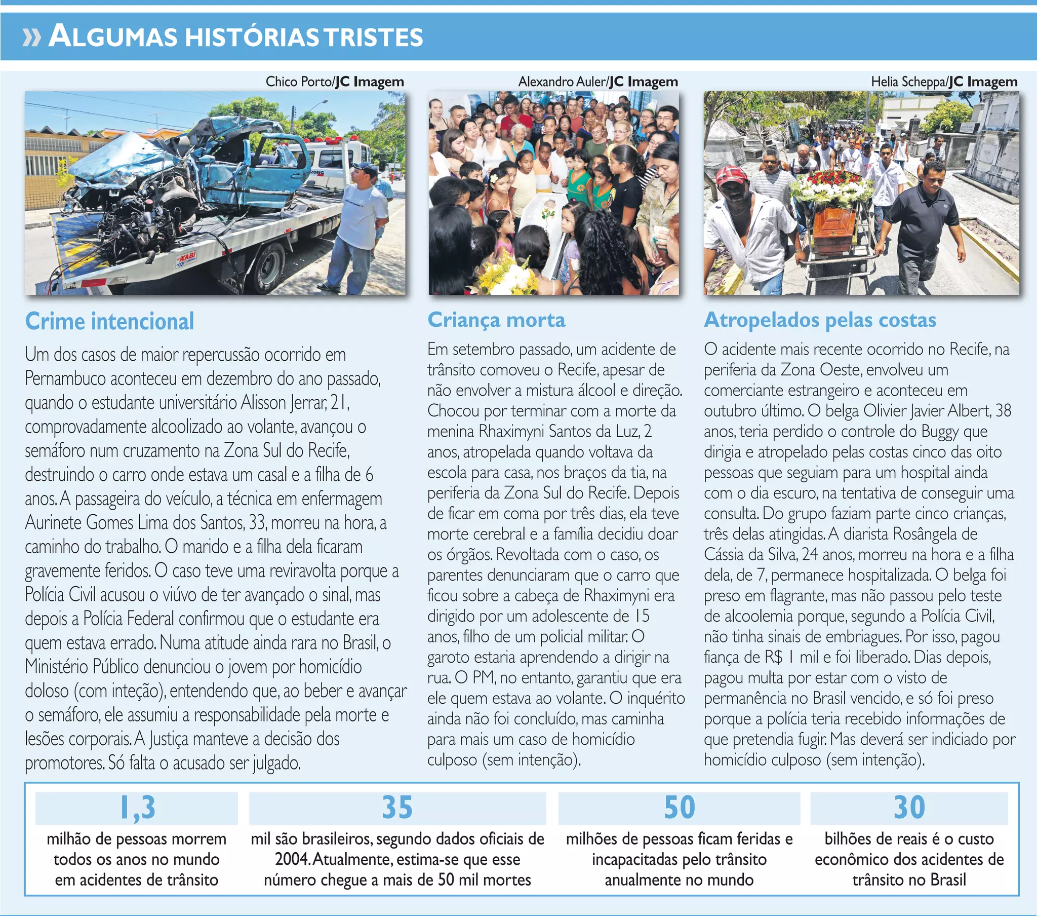 O documento resume 3 histórias tristes envolvendo acidentes de trânsito em Pernambuco que resultaram em morte ou ferimentos graves. O primeiro caso envolveu um estudante bêbado que avançou um sinal e matou uma mulher. O segundo caso foi o atropelamento fatal de uma criança pequena. O terceiro envolveu um estrangeiro que atropelou várias pessoas pelas costas com um buggy.