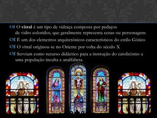 O vitral é um tipo de vidraça composta por pedaços de vidro coloridos que representam cenas ou personagens. Originou-se no Oriente no século X e era usado na arquitetura gótica e para instrução religiosa. Diferentes técnicas como o uso de chumbo, cores de metais e vidros fundidos permitiram a evolução estética e funcional dos vitrais.