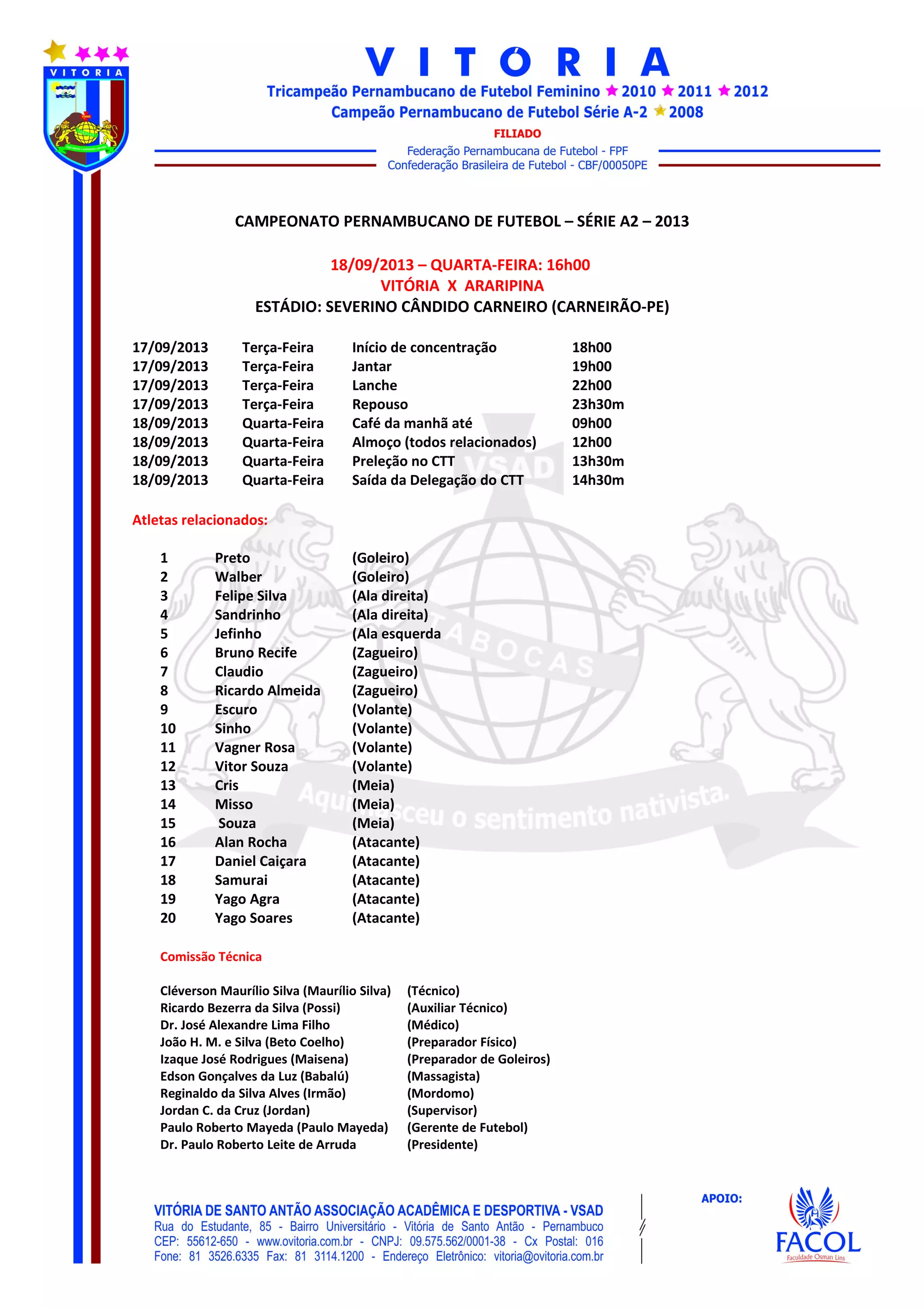 O documento descreve o jogo entre Vitória x Araripina válido pelo Campeonato Pernambucano de Futebol Série A2 em 2013, incluindo a programação da concentração da equipe Vitória, lista de jogadores relacionados e comissão técnica. O jogo será realizado no Estádio Severino Cândido Carneiro às 16h do dia 18 de setembro.