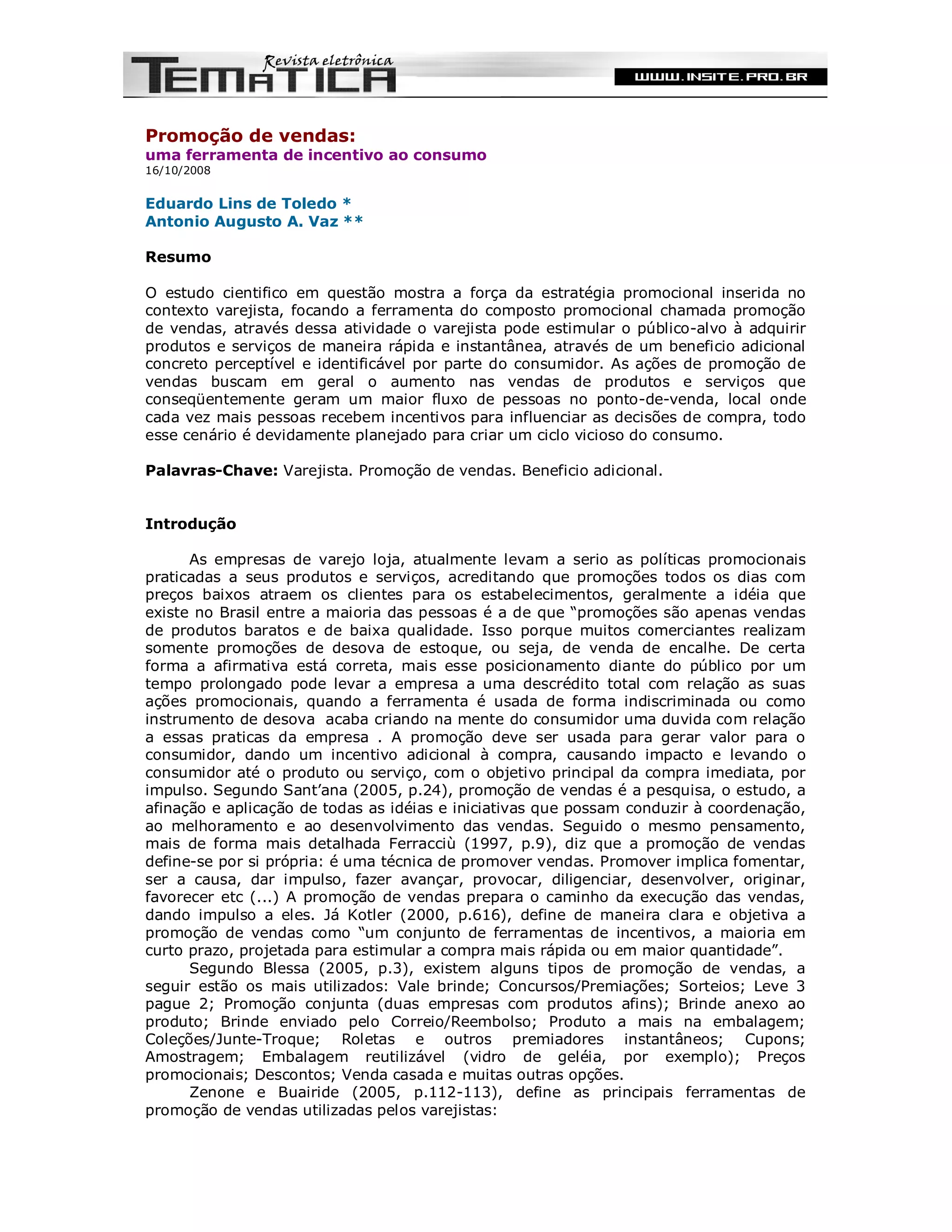 O documento discute a promoção de vendas como uma estratégia de marketing usada por varejistas para incentivar o consumo. Ele explica que as promoções de vendas oferecem benefícios adicionais aos consumidores para estimular compras impulsivas e aumentar o fluxo de clientes e vendas. Também lista e descreve vários tipos comuns de promoções de vendas e discute como elas são planejadas e implementadas de forma a influenciar as decisões de compra dos consumidores.