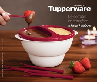 Este documento fornece informações sobre uma vitrine de produtos da Tupperware para a semana de 21 a 24 de 2017. A vitrine promove produtos para preparar, armazenar e servir refeições românticas para dois, com foco em descontos de até 30%. Também apresenta novidades como a Panela de Pressão para Micro-ondas.