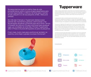 O documento fornece informações sobre produtos da Tupperware para crianças, incluindo itens para armazenar, preparar e servir alimentos. Resume os principais produtos apresentados, como o Dosador de Leite em Pó para armazenar leite em pó, os copos temáticos Jake O Pirata e Doutora Brinquedos para servir, e a opção de fazer Cupcake na Xícara no micro-ondas.