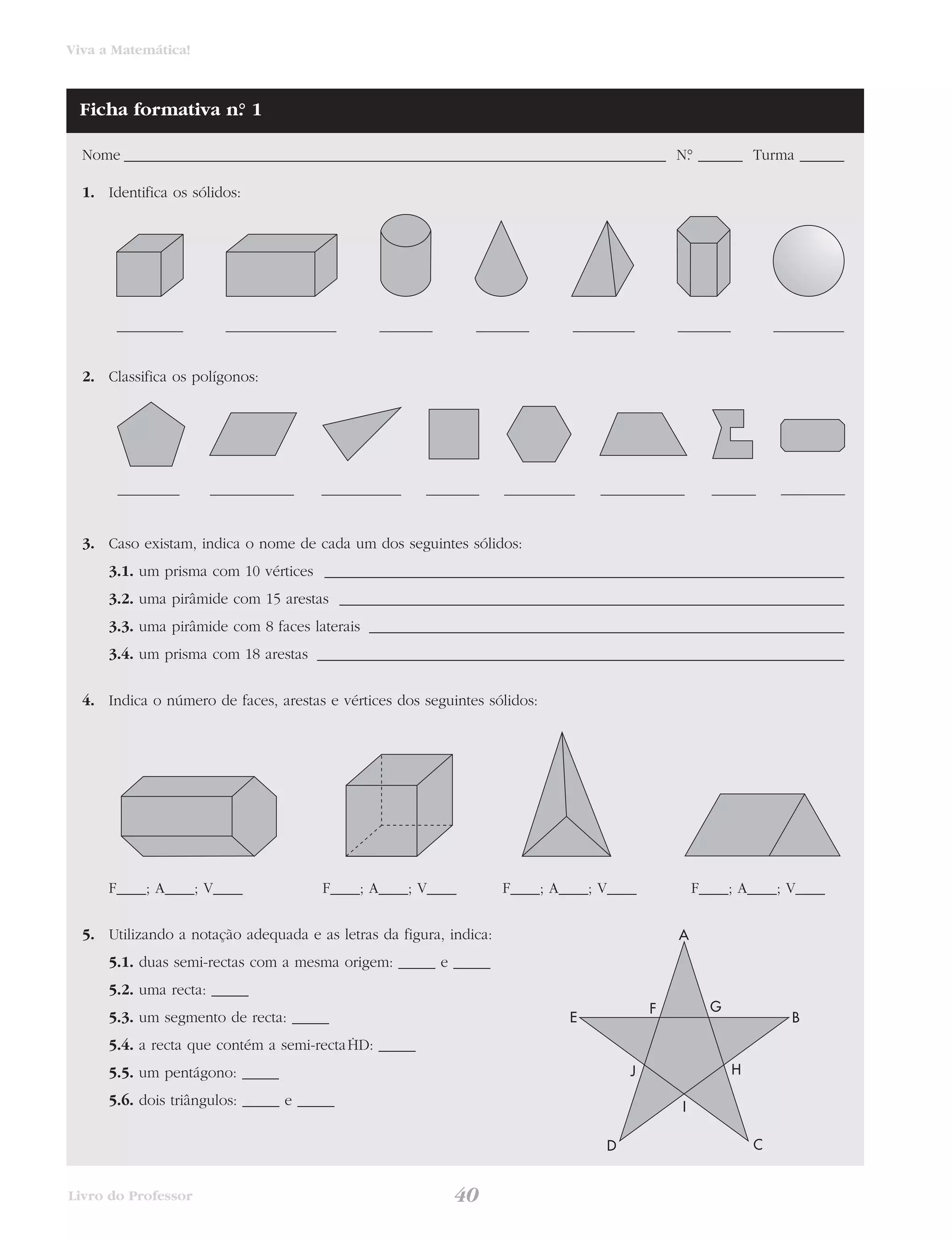 Este documento é uma ficha de exercícios de matemática com 12 questões sobre vários tópicos como identificação de sólidos, classificação de polígonos, nomes de sólidos, número de faces, arestas e vértices, notação geométrica, área de figuras planas e sólidos, perímetro e comprimento.