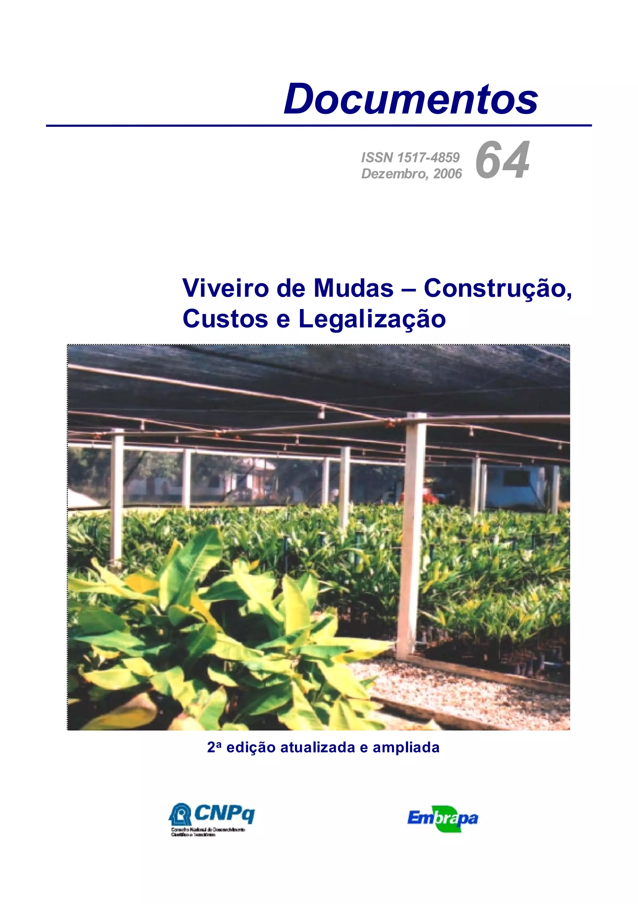 Este documento fornece informações sobre a construção, custos e legalização de viveiros de mudas. Ele discute os tipos de viveiros, materiais necessários para construção, dimensões recomendadas, sistemas de irrigação, custos envolvidos e processos legais. O documento visa auxiliar produtores rurais a construírem viveiros eficientes para produzir mudas de qualidade de forma sustentável.