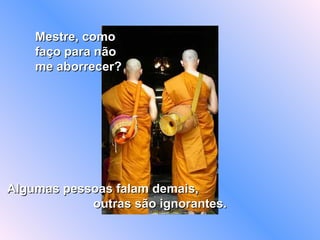 Um monge questiona o mestre sobre como evitar o aborrecimento com os defeitos dos outros. O mestre instrui o monge a viver como as flores, que apesar de crescerem no esterco, permanecem puras e perfumadas, extraindo apenas o que é útil e saudável e não permitindo que o azedume manche suas pétalas.