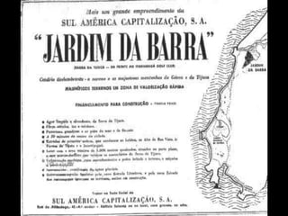 O documento descreve a história de um terreno na Barra da Tijuca que foi anunciado para venda, mas que poucos compraram na época devido à falta de infraestrutura e acesso. Com o desenvolvimento da região ao longo dos anos, incluindo a abertura de túneis e avenidas, o terreno valorizou muito e hoje representa uma grande oportunidade de investimento.