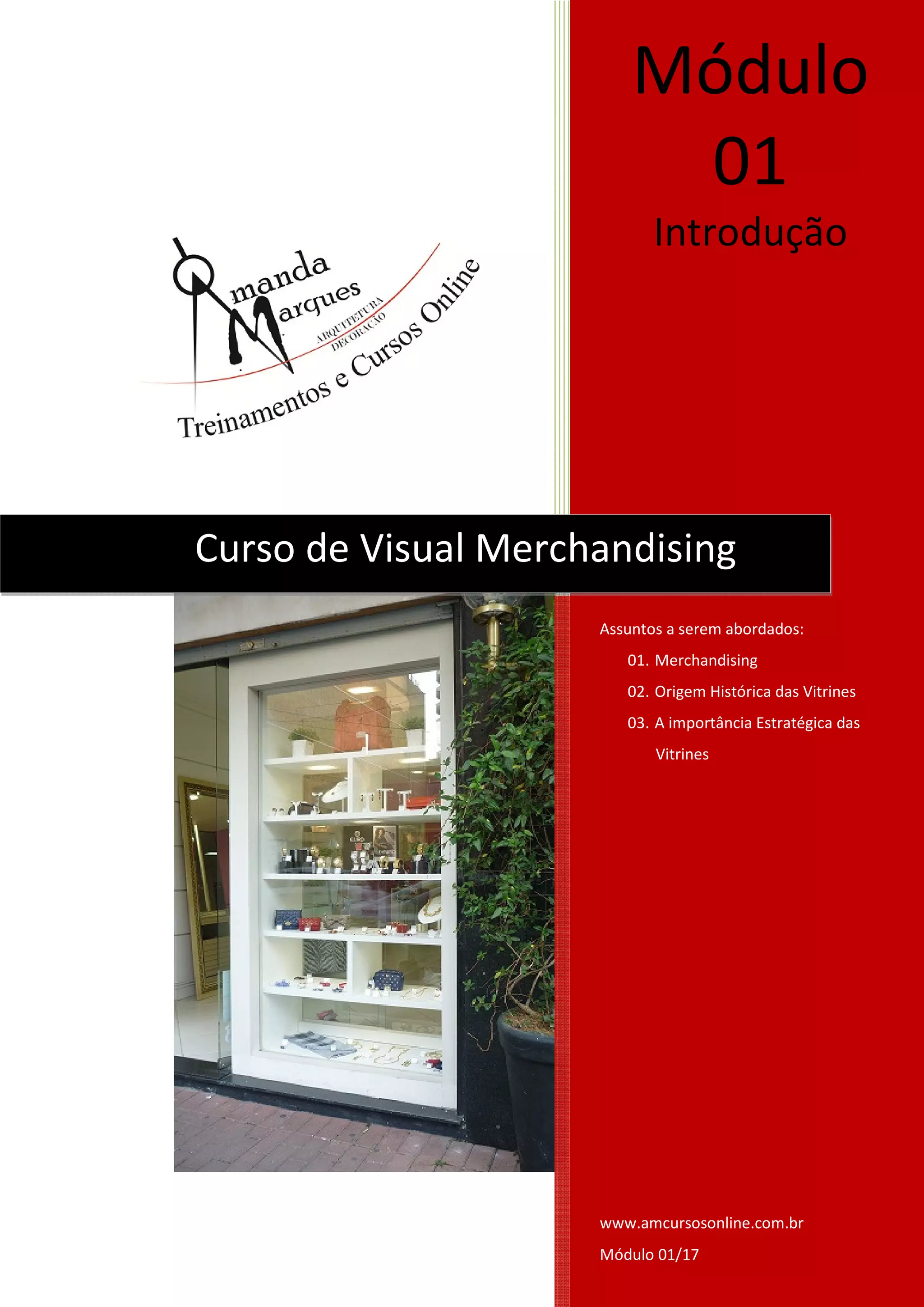 O documento introduz o curso de Visual Merchandising, abordando os tópicos de merchandising, origem histórica das vitrines e importância estratégica das vitrines.