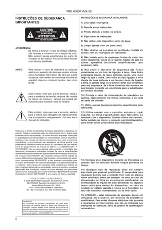 Este documento fornece instruções de segurança e operação para o mixer de DJ PRO MIXER VMX100. Ele descreve as partes frontal e traseira do mixer, explicando os controles e conexões. Inclui instruções sobre ajuste de ganho, equalização, monitores, contagem de batidas e transição entre canais.