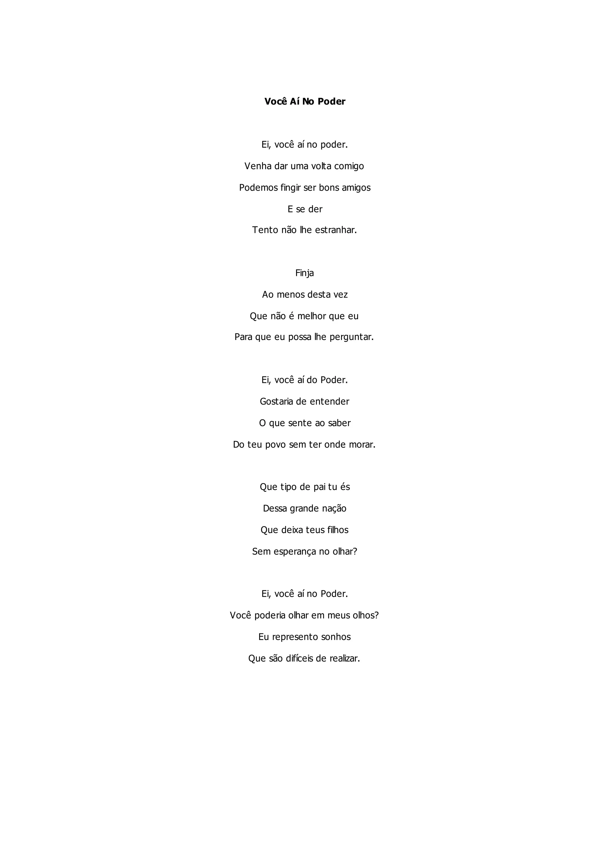 A poema critica o líder político por deixar o povo sem moradia e esperança, questionando como ele consegue dormir à noite sabendo das dificuldades do povo e das vidas perdidas sob seu governo. O poeta convida o líder para uma conversa, mas sabe que ele não aceitaria para evitar responder perguntas incômodas.