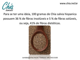 ![Para se ter uma ideia, 100 gramas de Chia salvia hispanica possuem 36 % de fibras insolúveis e 5 % de fibras solúveis, ou seja, 41% de fibras dietéticas. www.chia.ind.br [email_address] / Telefone: (49) 3433.0100](https://image.slidesharecdn.com/slidesharechia8texto-120214101223-phpapp02/85/Voce-quer-parar-de-sofrer-com-intestino-preso-2-320.jpg)