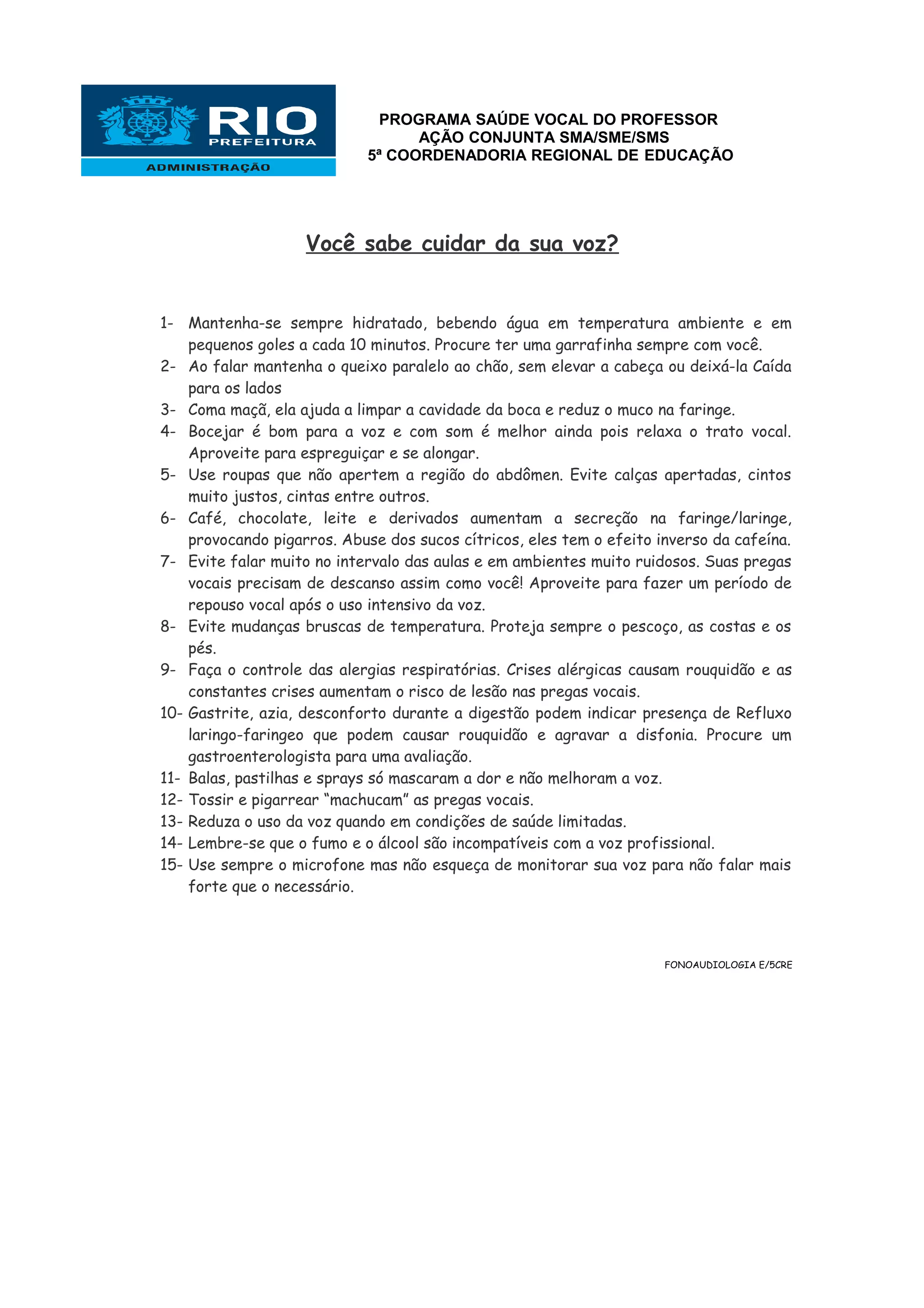 Este documento fornece 15 dicas para cuidados vocais, incluindo manter-se hidratado, falar com postura correta, comer maçãs, fazer alongamentos e evitar falar em ambientes ruidosos ou quando com saúde limitada.