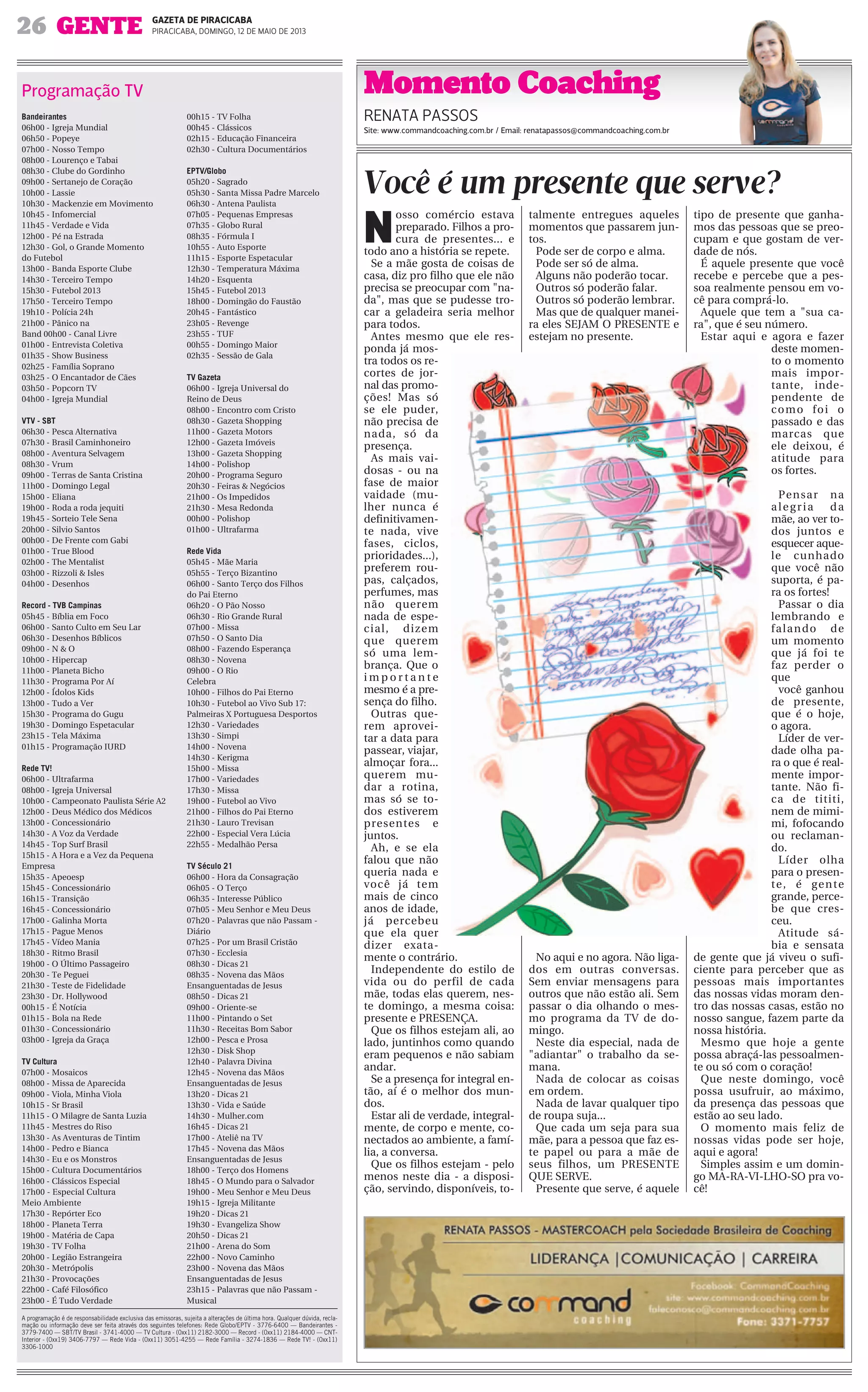 Este artigo fornece conselhos sobre como ser um presente que serve para as mães no Dia das Mães. Ele enfatiza que as mães querem acima de tudo a presença e o carinho dos filhos, não importando os presentes materiais. Aconselha os filhos a estarem totalmente presentes, sem distrações, aproveitando o momento com as mães.