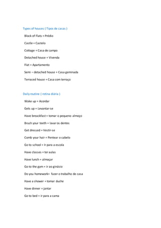 Este documento fornece um resumo de vocabulário em inglês sobre países e nacionalidades, tipos de casas, rotinas diárias, tarefas domésticas, disciplinas escolares, locais da escola, clubes escolares, características físicas, personalidade, roupas, locais da cidade, atividades na cidade, meios de transporte, onde ficar de férias, o que levar de férias, atividades de lazer, atividades na praia.