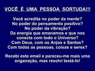 VOCÊ É UMA PESSOA SORTUDA!!! Você acredita no poder da mente? No poder do pensamento positivo? No poder da vibração? Da energia que emanamos e que nos conecta com todo o Universo? Com Deus, com os Anjos e Santos? Com todas as pessoas, coisas e seres? Recebi este email e pareceu-me mais uma enganação, mas resolvi testá-lo!