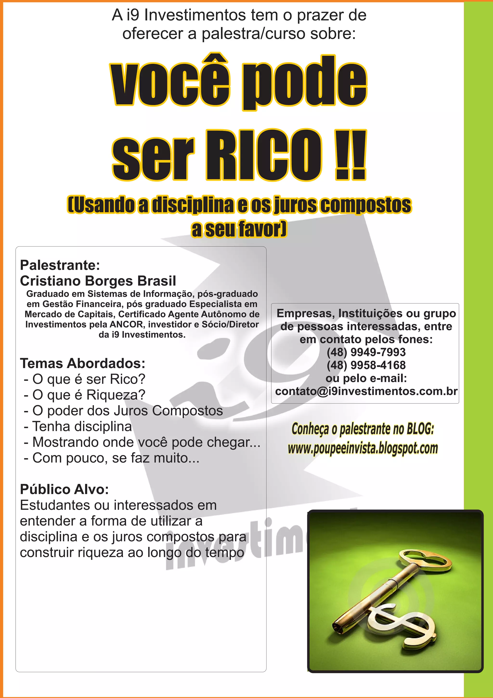 O documento anuncia uma palestra sobre como se tornar rico utilizando a disciplina e os juros compostos a seu favor, ministrada por Cristiano Borges Brasil. Os temas abordados incluem o significado de ser rico e riqueza, o poder dos juros compostos e como ter disciplina para construir riqueza com pouco ao longo do tempo. O público-alvo são estudantes ou pessoas interessadas em entender como utilizar esses conceitos financeiros.