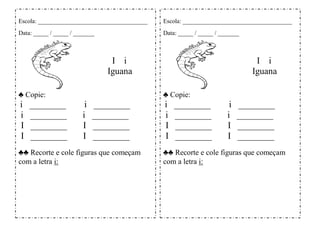 O documento pede para os alunos recortarem e colarem figuras que começam com a letra "i", como a palavra "iguana" escrita no topo. As crianças devem copiar a palavra "iguana" quatro vezes e recortar e colar imagens correspondentes a cada letra "i". O objetivo é praticar habilidades motoras finas e reconhecimento de letras.