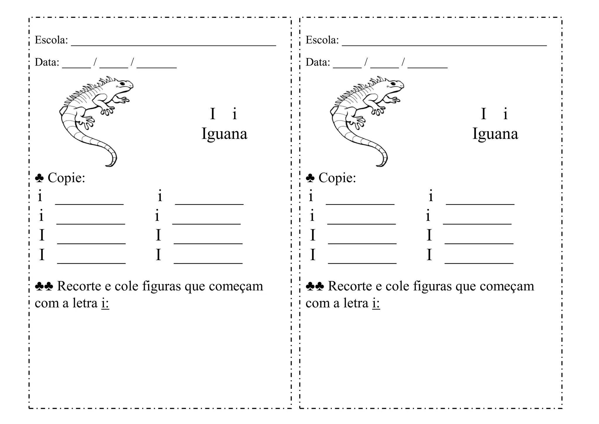 O documento pede para os alunos recortarem e colarem figuras que começam com a letra "i", como a palavra "iguana" escrita no topo. As crianças devem copiar a palavra "iguana" quatro vezes e recortar e colar imagens correspondentes a cada letra "i". O objetivo é praticar habilidades motoras finas e reconhecimento de letras.
