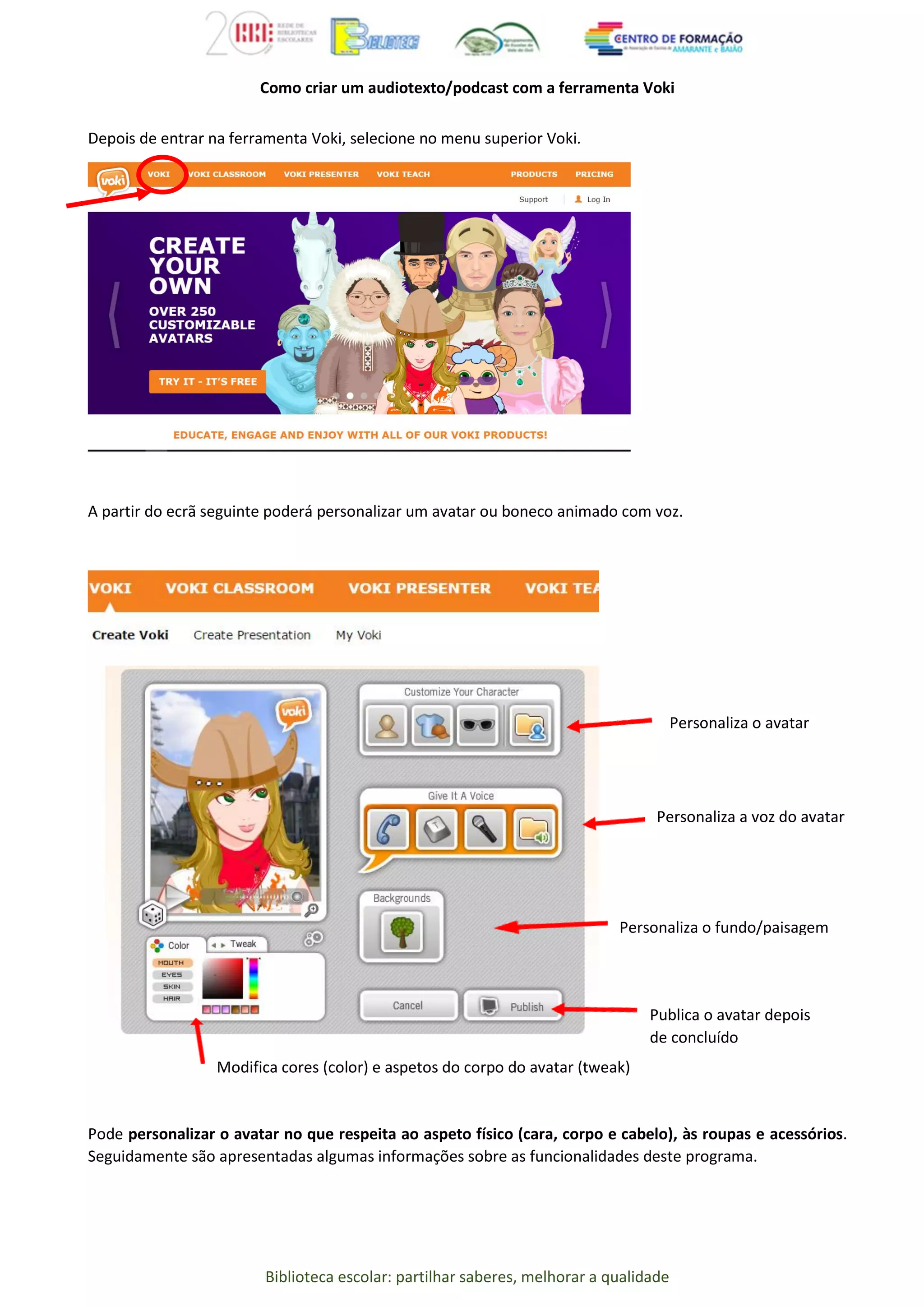 O documento orienta sobre como criar audiotextos ou podcasts utilizando a ferramenta Voki, detalhando etapas de personalização de avatares, escolha de cenários e adição de áudio. Sugere que o usuário pode escolher entre gravar sua própria voz ou usar texto, além de mencionar funcionalidades do programa e limitações da versão gratuita. Também menciona a possibilidade de armazenar avatares para edição futura mediante inscrição na ferramenta.