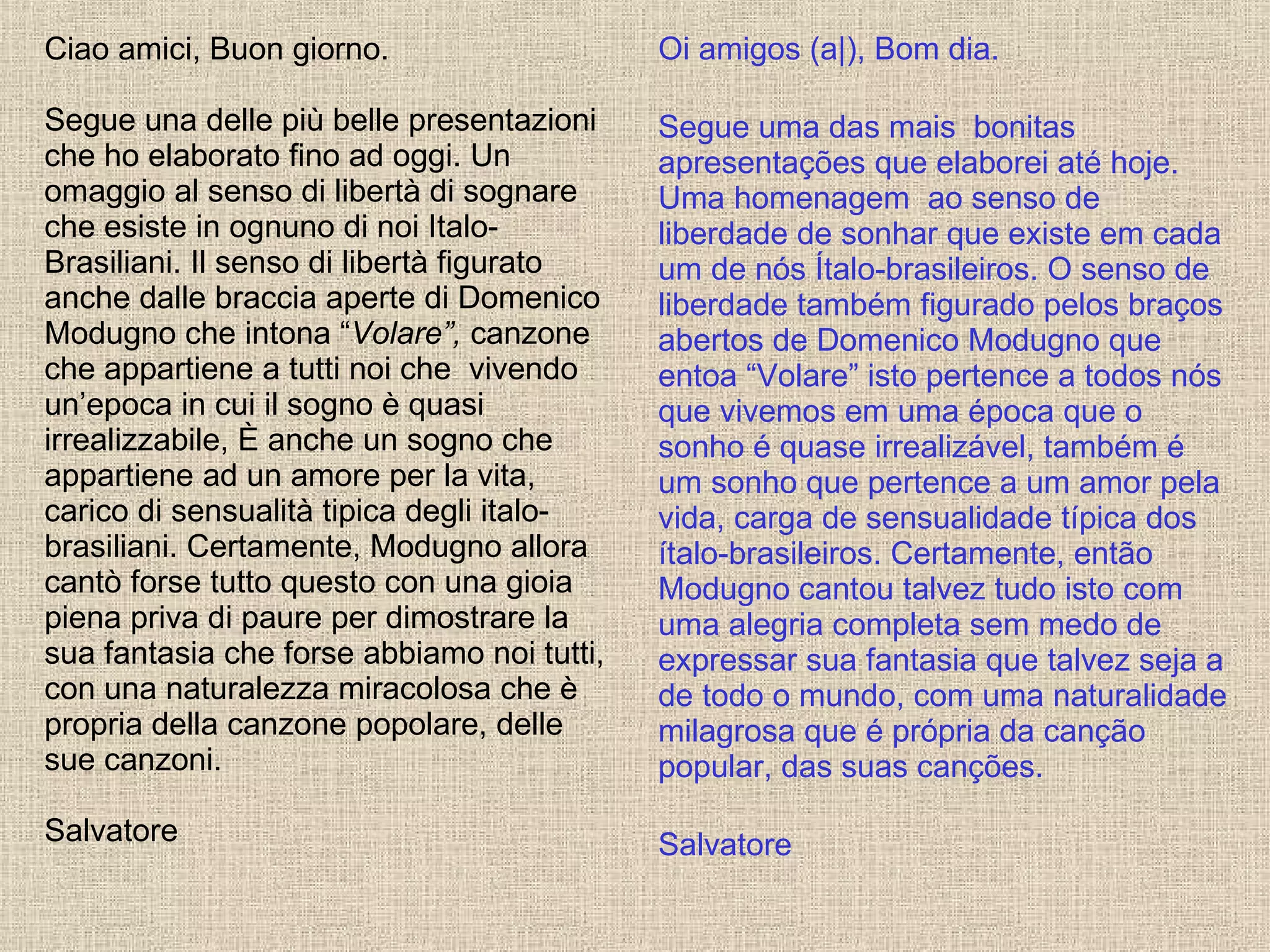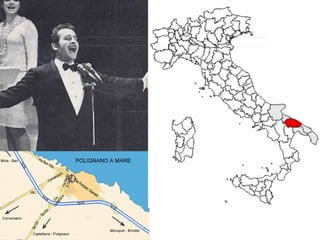 O documento descreve a vida e carreira do cantor e compositor italiano Domenico Modugno. Fala sobre seu nascimento em Polignano a Mare na Itália, seu amor pela música desde criança, seu sucesso internacional com a canção "Volare" em 1958 e sua carreira de sucesso como um dos principais nomes da música popular italiana, antes de sua morte prematura em 1994.