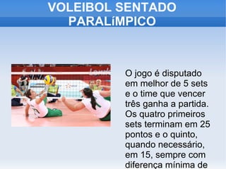 O documento descreve as regras básicas do voleibol sentado paralímpico, incluindo que as partidas são disputadas em melhor de 5 sets, com os 4 primeiros terminando em 25 pontos e o 5o em 15 pontos, e que os jogadores devem estar em contato com o chão sempre que tocarem na bola.