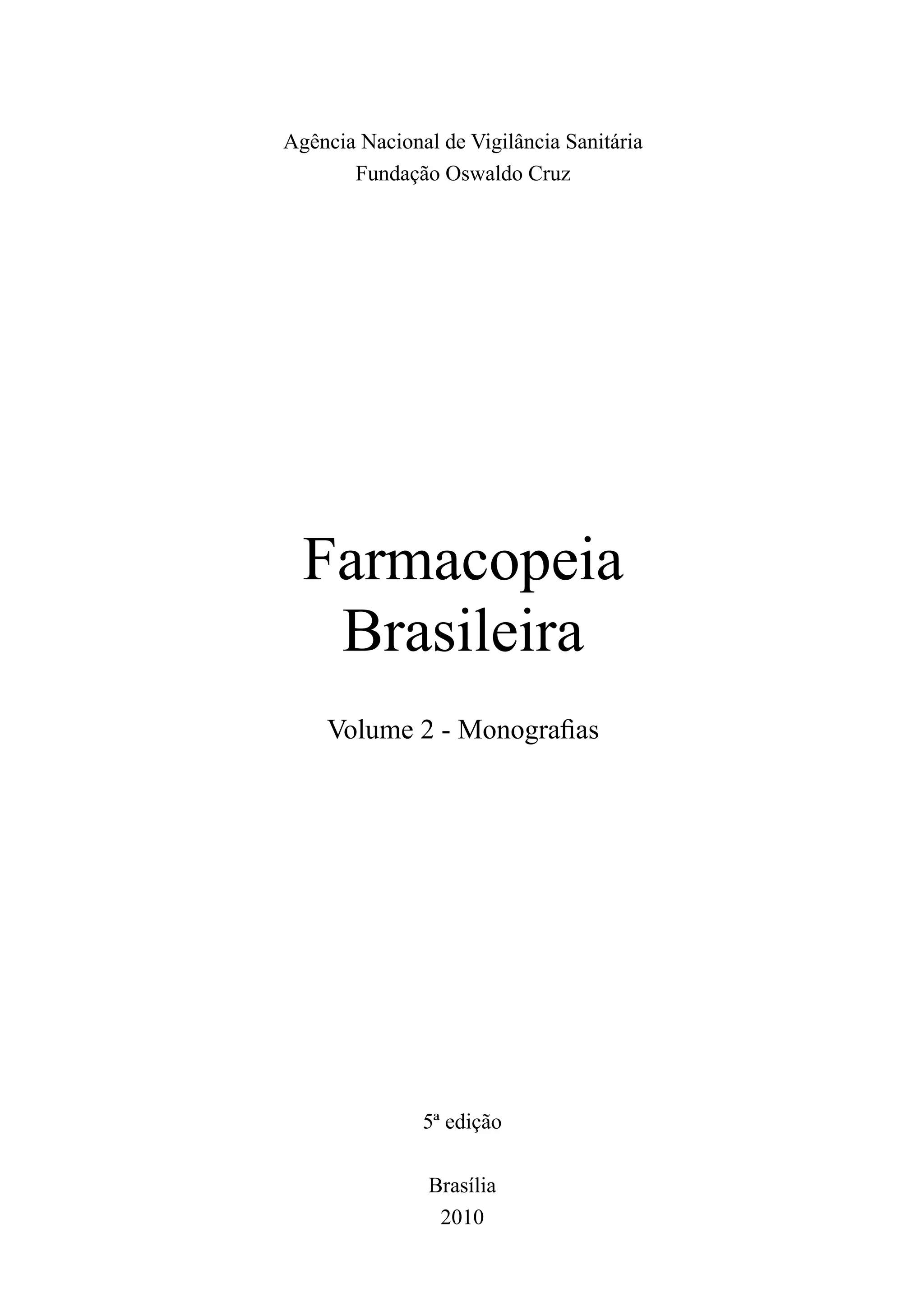 O documento apresenta informações sobre a 5a edição da Farmacopeia Brasileira, incluindo sua aprovação pela Agência Nacional de Vigilância Sanitária e detalhes sobre sua publicação e distribuição. É definido que os insumos farmacêuticos, medicamentos e outros produtos sujeitos à vigilância sanitária devem atender às normas e especificações estabelecidas na Farmacopeia Brasileira.