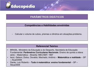 Este documento apresenta um plano de aula sobre volume dos sólidos geométricos: cubo, prisma e cilindro. O plano inclui atividades de revisão, apresentação do tema, perguntas desafiadoras e uma avaliação inicial dos alunos. O objetivo é que os alunos aprendam a calcular o volume destes sólidos e resolver problemas relacionados.