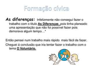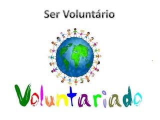 O documento discute o tema do voluntariado, definindo-o como um conjunto de ações de interesse social e comunitário realizadas sem remuneração. Apresenta os princípios, direitos e deveres dos voluntários segundo a lei portuguesa e discute exemplos de organizações que utilizam trabalho voluntário em Portugal e no mundo.