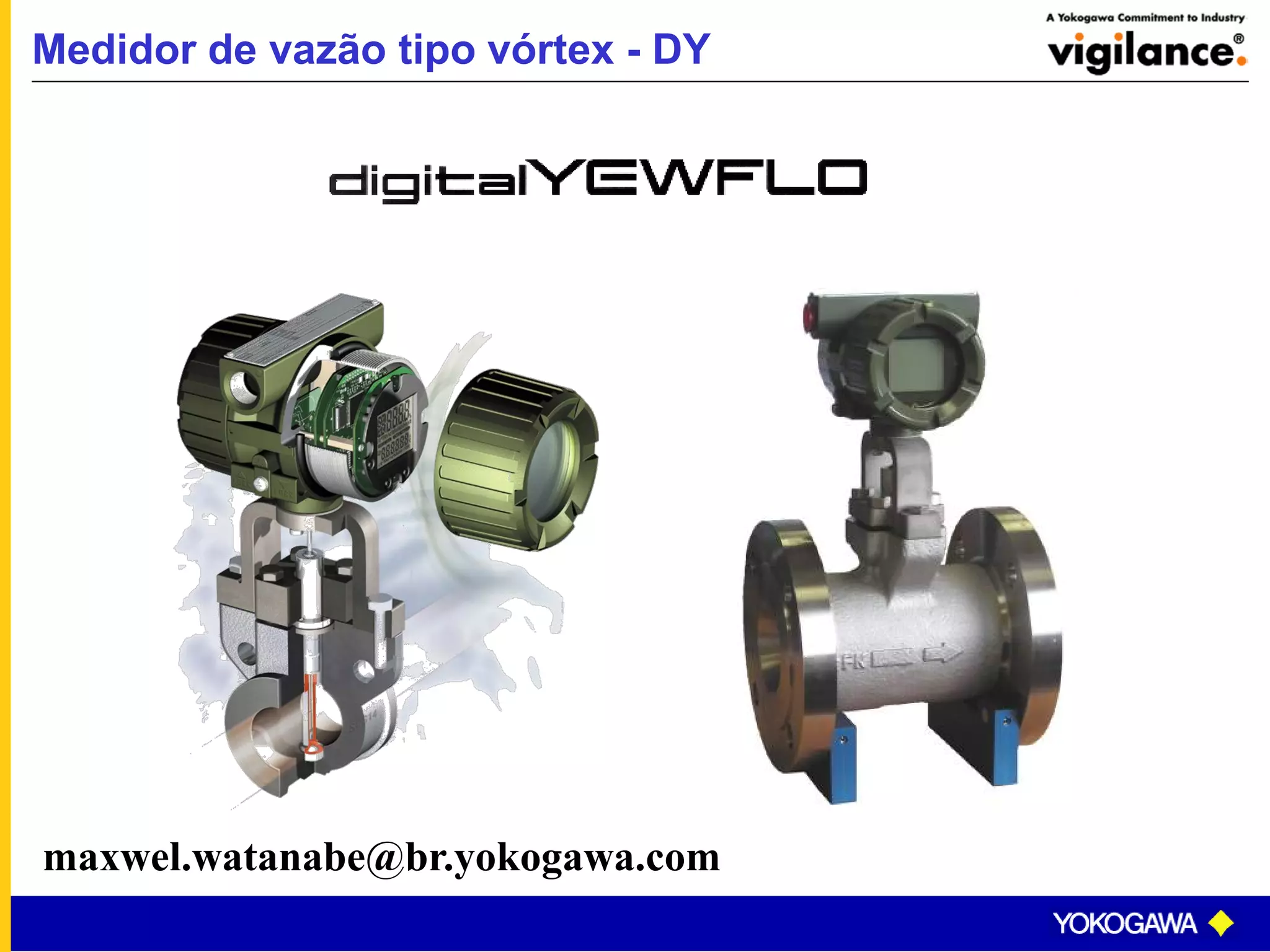 O documento descreve o princípio de funcionamento e características técnicas de um medidor de vazão do tipo vórtex. O medidor funciona medindo a frequência de vórtices gerados no fluido, que é proporcional à vazão. Possui alta precisão e baixa perda de carga, com saídas digitais e analógicas. É adequado para medição de gases, líquidos e vapores.