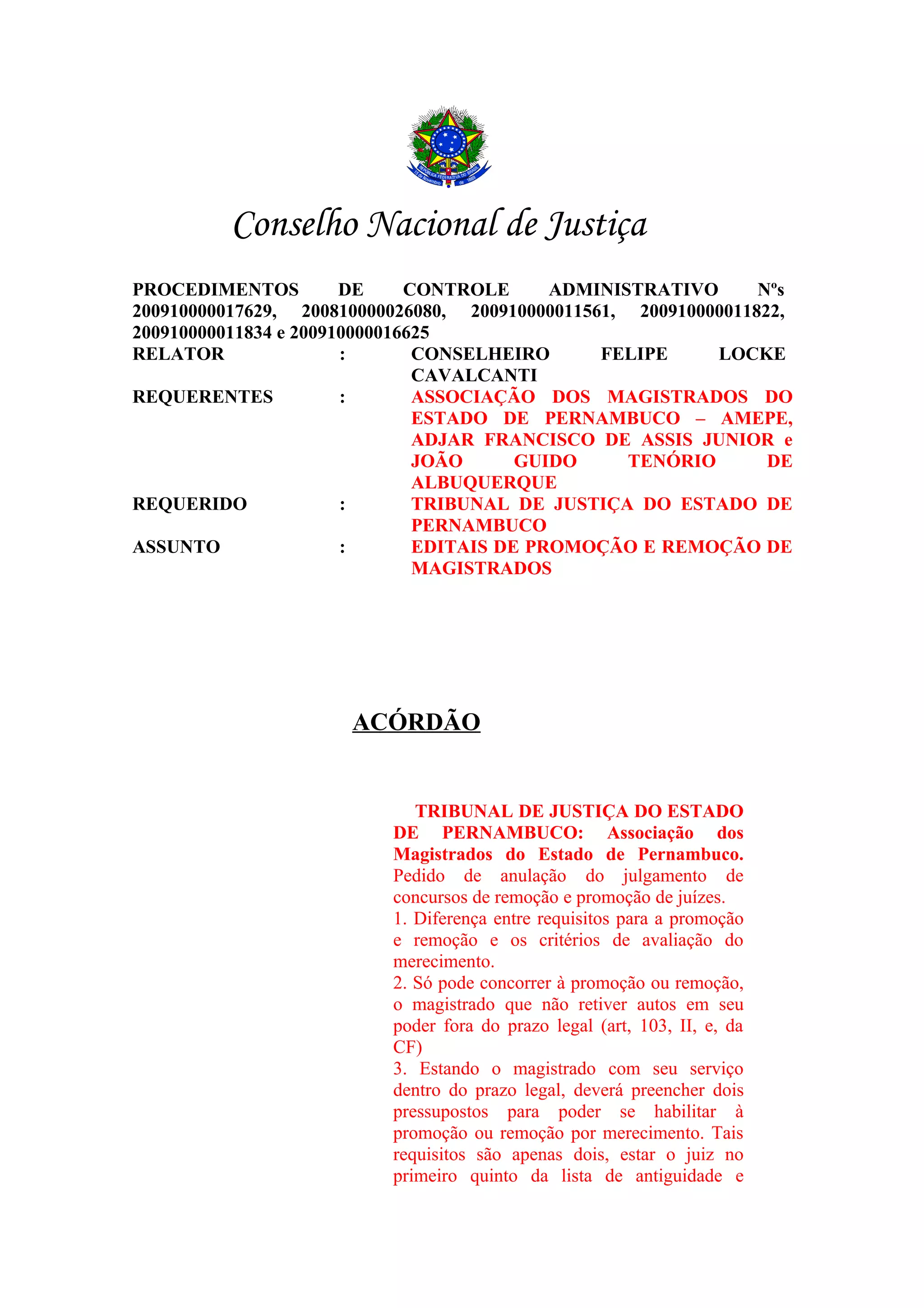Este documento trata de um processo no Conselho Nacional de Justiça movido pela Associação dos Magistrados de Pernambuco contra o Tribunal de Justiça de Pernambuco questionando editais de promoção e remoção de juízes. O CNJ julgou procedente em parte o pedido, anulando alguns editais mas mantendo outros. O tribunal deverá observar a diferença entre requisitos e critérios para promoção, exigindo frequência a cursos dentro dos quintos de antiguidade.