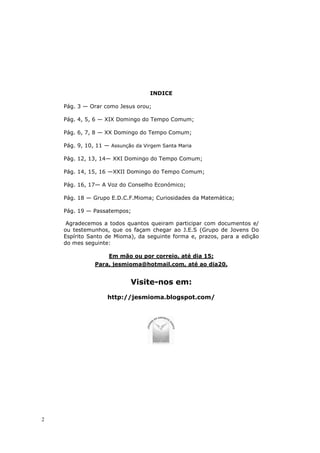 Este documento contém um índice de páginas de um boletim chamado "Mioma" com informações sobre diversos tópicos religiosos como orações, domingos do tempo comum, a assunção da Virgem Maria, voz do conselho econômico e curiosidades matemáticas. Também fornece instruções para envio de contribuições futuras.