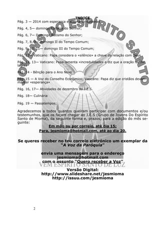O documento apresenta a oração para o ano de 2014 e o índice de conteúdos da revista "A Voz da Paróquia". A oração pede a Deus que derrame suas bênçãos no ano, dando força e esperança para espalhar o bem, e que fique com os fiéis nos bons e maus momentos. O índice lista artigos sobre a mensagem do Papa para o ano novo, domingos litúrgicos, atividades da juventude e passatempos.