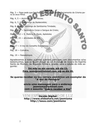 1) O documento descreve as leituras e orações para a missa do Domingo de Pentecostes, incluindo a celebração do Espírito Santo. 2) Também anuncia as atividades do grupo JES e pede contribuições para a próxima edição do boletim paroquial. 3) Fornece instruções sobre como receber o boletim digitalmente.