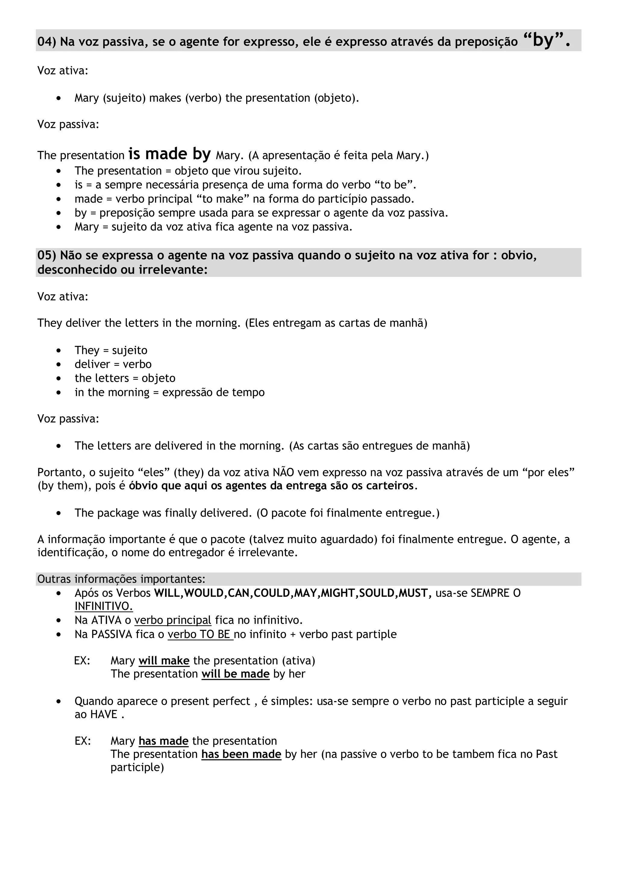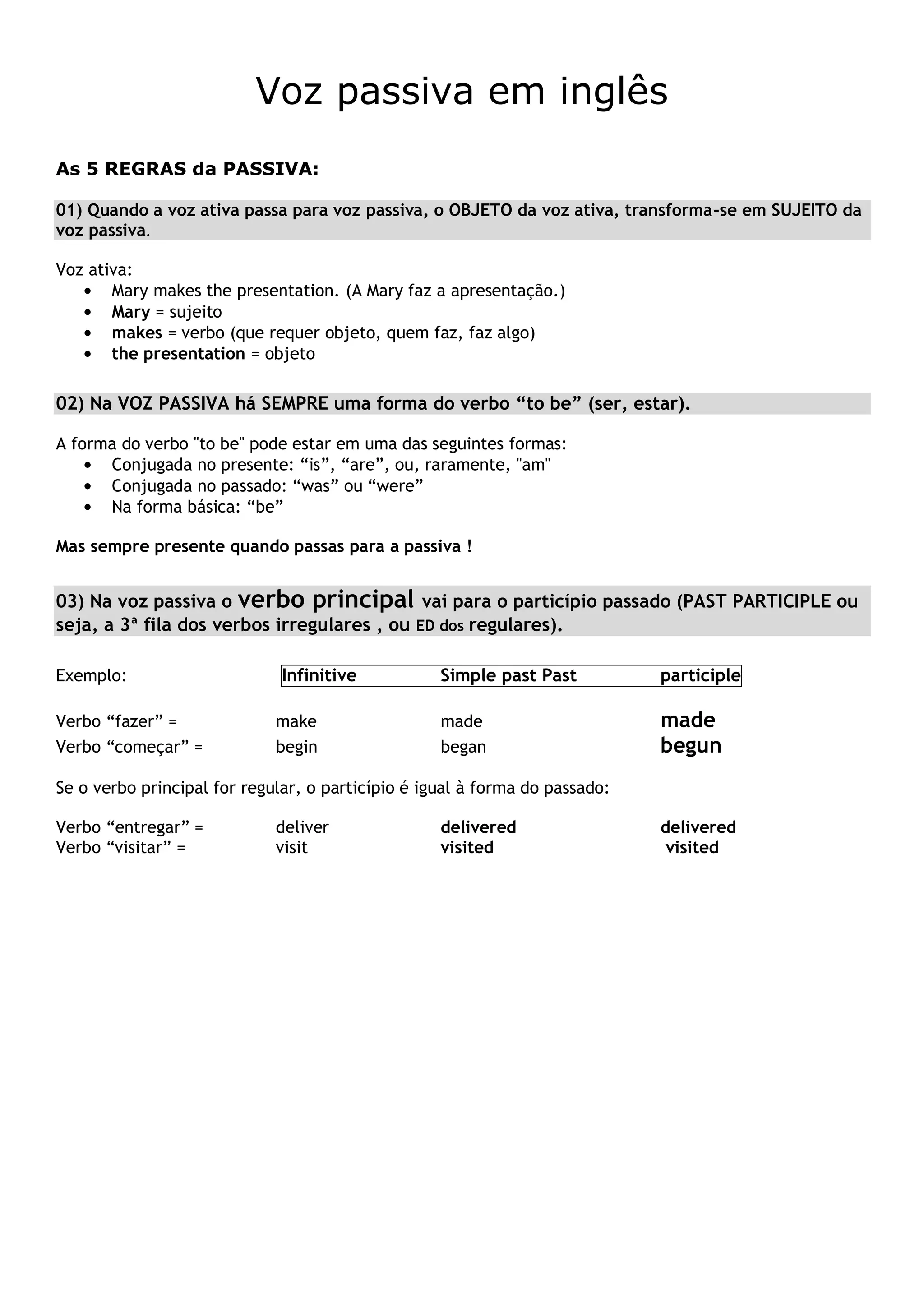 O documento resume as 5 regras da voz passiva em inglês: 1) o objeto da voz ativa se torna o sujeito na passiva; 2) sempre há uma forma do verbo "to be"; 3) o verbo principal vai para o particípio passado; 4) o agente é expresso por "by" se for relevante; 5) o agente é omitido se for óbvio, desconhecido ou irrelevante.