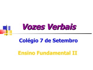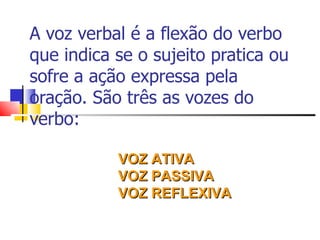 O documento descreve as três vozes verbais no português - ativa, passiva e reflexiva. Explica que a voz ativa ocorre quando o sujeito executa a ação verbal, a voz passiva quando o sujeito sofre a ação, e a voz reflexiva quando o sujeito executa a ação sobre si mesmo ou em reciprocidade com outro sujeito. Também fornece exemplos e instruções sobre como transformar orações entre voz ativa e passiva.