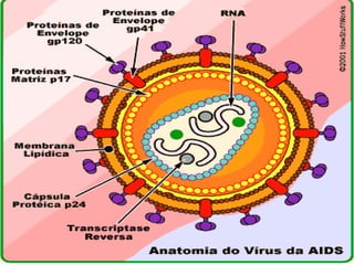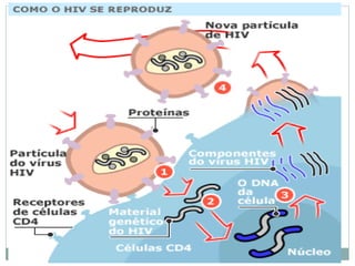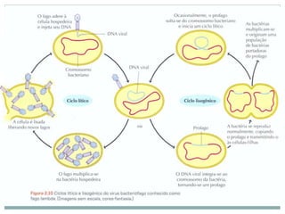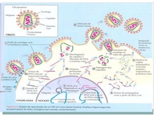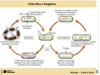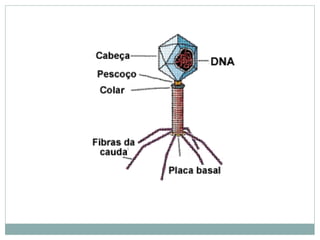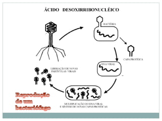 O documento descreve as principais características dos vírus, incluindo que eles não possuem metabolismo próprio, são compostos por material genético e proteínas, e precisam invadir células hospedeiras para se replicar. Também menciona brevemente a geneterapia viral e os estágios do ciclo de infecção viral: adesão, penetração, biossíntese e liberação.