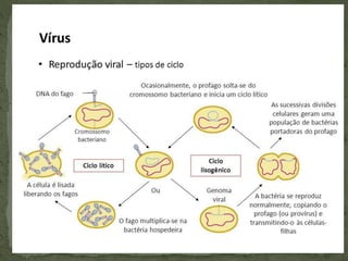 O documento discute a descoberta dos vírus no século XIX e suas principais características. Os vírus são entidades acelulares compostas por material genético e capsídeo, que só conseguem se reproduzir dentro de células hospedeiras. Existem diferentes teorias sobre a origem evolutiva dos vírus.