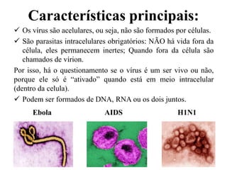 Os vírus são acelulares e parasitas intracelulares obrigatórios, podendo conter DNA, RNA ou ambos. Eles infectam células e usam o maquinário celular para se reproduzirem, podendo romper ou não a célula no processo.