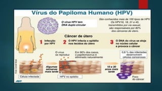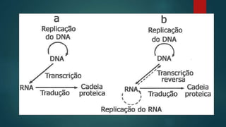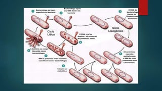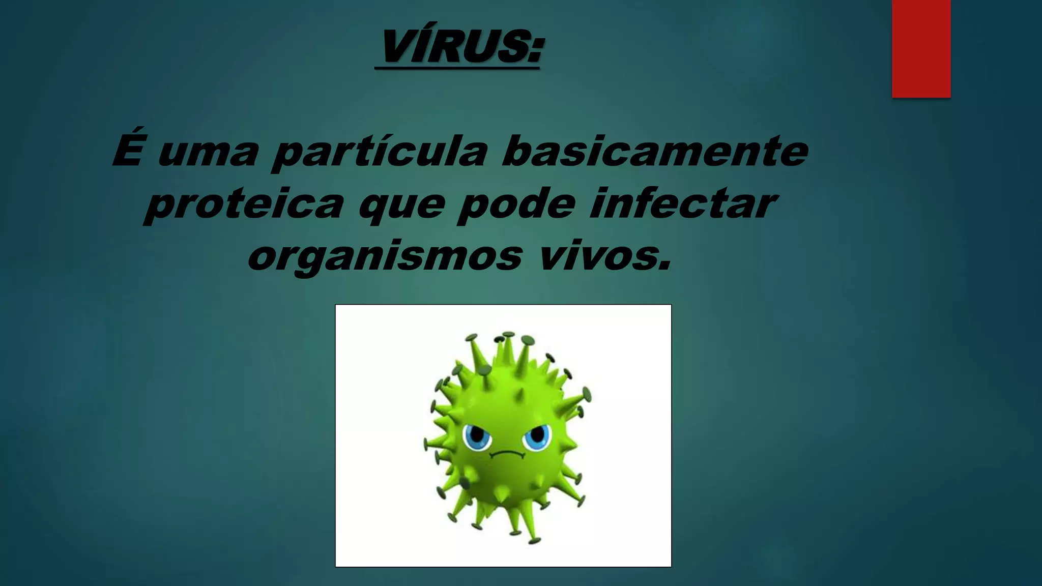 Vírus são partículas proteicas que infectam organismos vivos, dependendo de células para se multiplicar. Eles causam doenças como HPV e HIV, que respectivamente podem levar a câncer de colo do útero e AIDS se não tratados. O diagnóstico e tratamento de doenças virais, como a AIDS, é importante para o controle de epidemias.