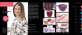 O documento apresenta receitas para compartilhar, dicas de como preparar, armazenar e servir comidas e sobre produtos para organizar a cozinha e a despensa. Inclui novidades, lançamentos e descontos em produtos da Tupperware.