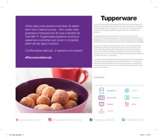 [1] O documento apresenta produtos e receitas da Tupperware, incluindo utensílios de cozinha, recipientes para armazenamento e preparo de alimentos. [2] São destacados lançamentos, promoções e descontos em itens como tigelas, copos, embalagens e acessórios para cozinha. [3] Uma receita de cebola caramelizada é apresentada para servir dentro de um hambúrguer.