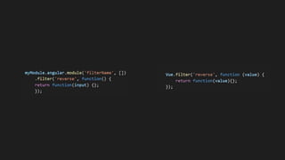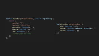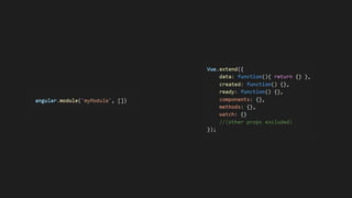 O documento compara os frameworks Vue.js, Angular e React, destacando que Vue.js é mais simples e focado em componentes, enquanto Angular utiliza data binding bidirecional e é mais pesado. A performance do Vue.js é superior devido ao seu sistema assíncrono, enquanto React usa virtual DOM para eficiência nas atualizações. A escolha entre esses frameworks depende das necessidades específicas do projeto, como simplicidade, performance e estilo de programação.