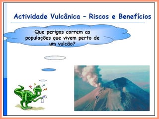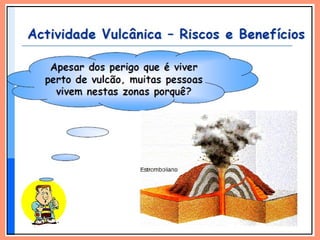 O documento discute o vulcanismo, listando exemplos de vulcões como o Etna e o Monte Santa Helena. Ele descreve os tipos de materiais expelidos durante erupções vulcânicas, incluindo sólidos, líquidos e gases. O documento também explica os diferentes tipos de erupções vulcânicas - efusivas, mistas e explosivas - e como a viscosidade da lava afeta o tipo de erupção.