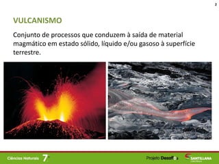 O documento discute o vulcanismo, definindo-o como o conjunto de processos que conduzem à saída de material magmático à superfície terrestre. Explica que os vulcões se localizam principalmente nos limites das placas tectônicas e que existem dois tipos principais de vulcanismo - efusivo e explosivo - determinados pela viscosidade da lava e teor de gases. Também destaca alguns benefícios do vulcanismo para os humanos, como a fertilidade dos solos.