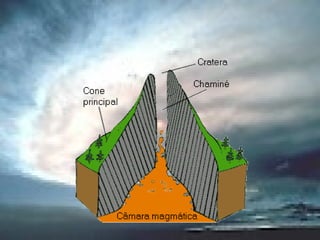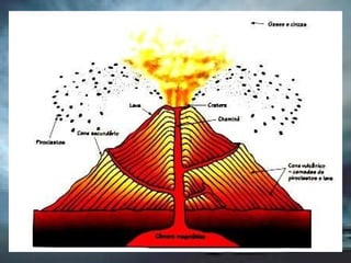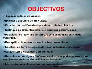 O documento discute o vulcanismo, explicando: 1) Os tipos de vulcões são classificados de acordo com sua localização em relação às placas tectônicas; 2) A atividade vulcânica pode ser explosiva, efusiva ou mista, dependendo da composição da lava e dos materiais expelidos; 3) A distribuição de vulcões é maior ao longo das bordas de placas e pontos quentes no Oceano Pacífico.