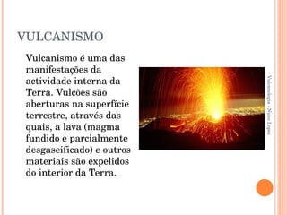 Este documento descreve o vulcanismo, incluindo sua definição, tipos de vulcões e erupções, materiais expelidos, e métodos para minimizar riscos. Explica que vulcões são aberturas que expelam lava e outros materiais do interior da Terra, e classifica o magma e tipos de erupções e lava. Também discute benefícios do vulcanismo apesar dos riscos, como fertilidade dos solos e águas termais.