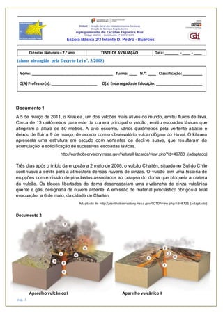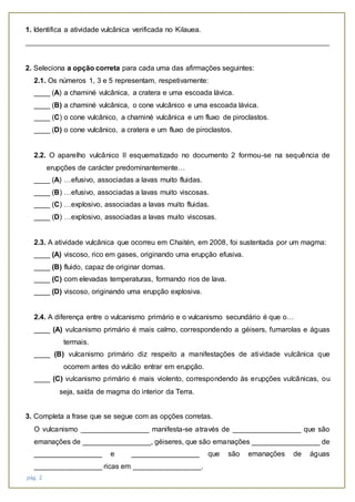 O documento descreve duas erupções vulcânicas recentes. A primeira ocorreu no vulcão Kilauea no Havaí em 2011, onde fluxos de lava atingiram 50 metros de altura. A segunda ocorreu no vulcão Chaitén no Chile em 2008, onde densas nuvens de cinzas continuaram a ser emitidas por três dias, forçando a evacuação da cidade de Chaitén. O documento também inclui informações gerais sobre atividade vulcânica e suas manifestações.